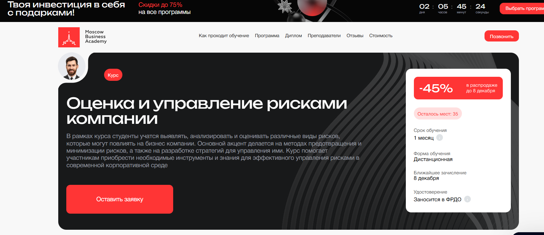 Оценка и управление рисками компании от Moscow Business Academy — месячная программа повышения квалификации для топ-менеджеров с изучением финансовых, операционных и стратегических угроз.