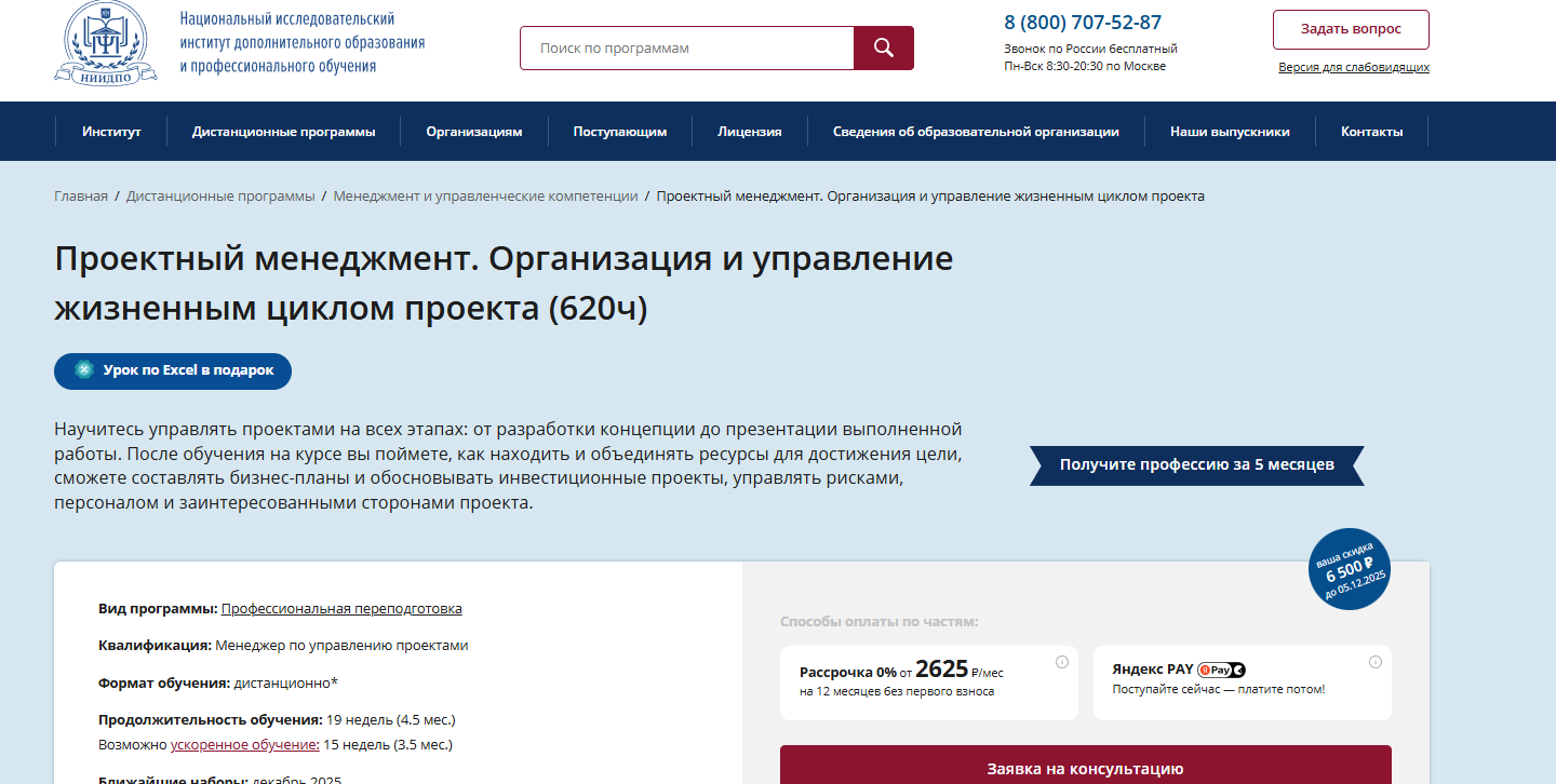 ⭐ Проектный менеджмент от НИИДПО — программа профессиональной переподготовки на 620 часов с углубленным изучением управления рисками в проектной деятельности.