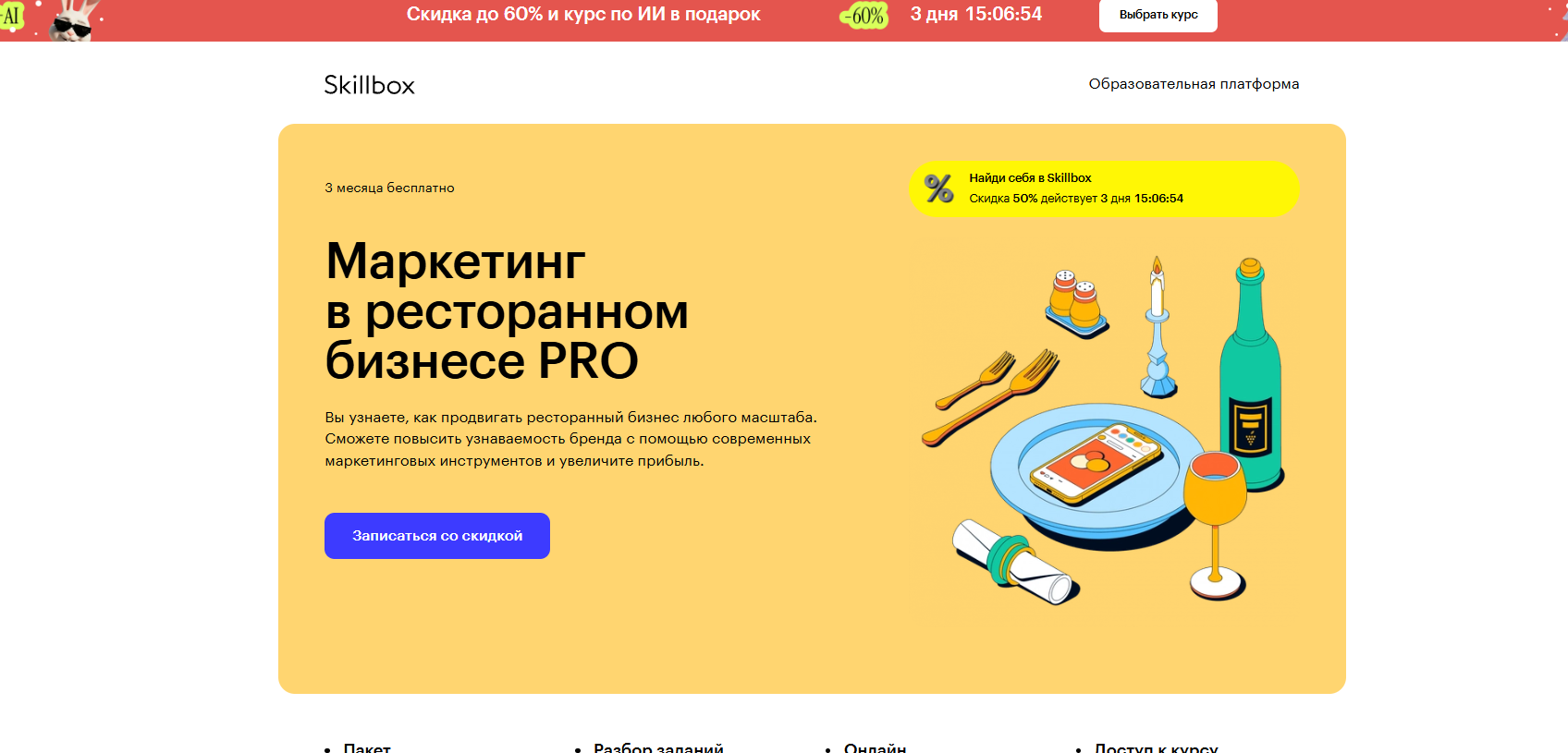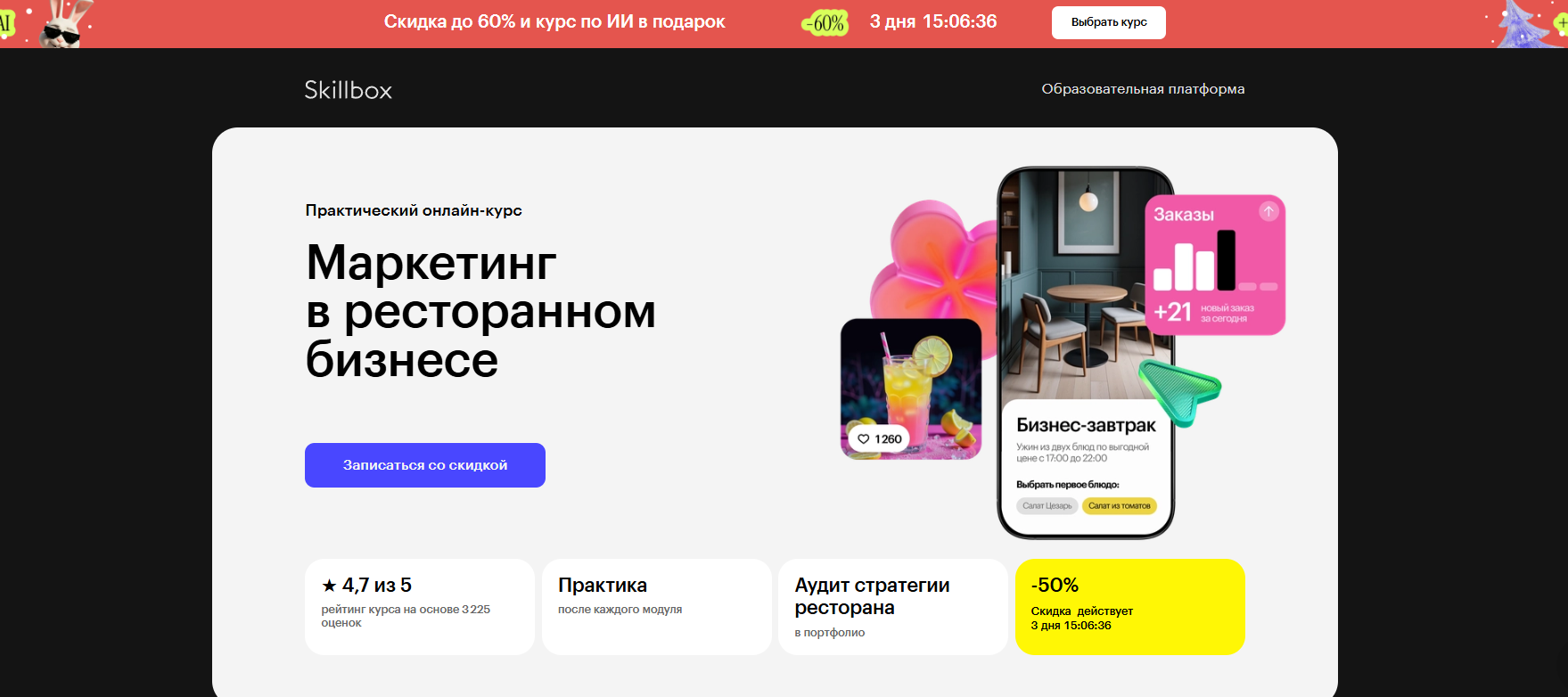 ⭐ Ресторанный маркетинг от Skillbox — специализированный курс по digital-маркетингу для ресторанов с фокусом на практические инструменты продвижения кафе и управление репутацией заведений.