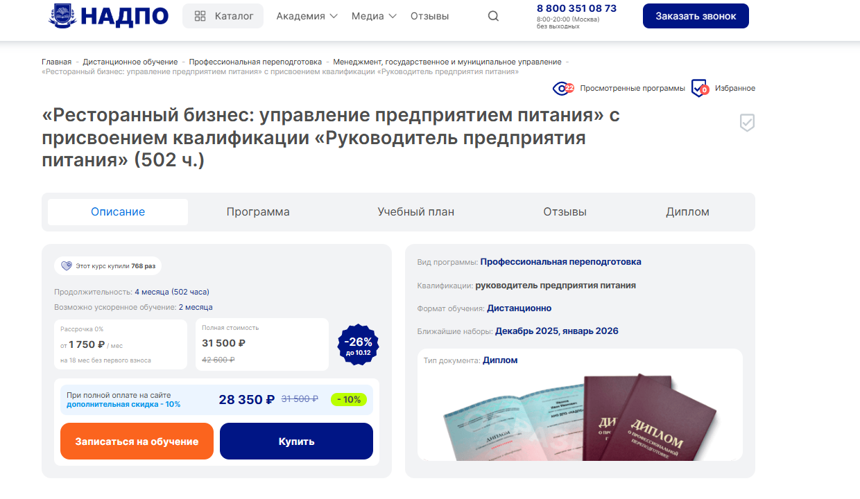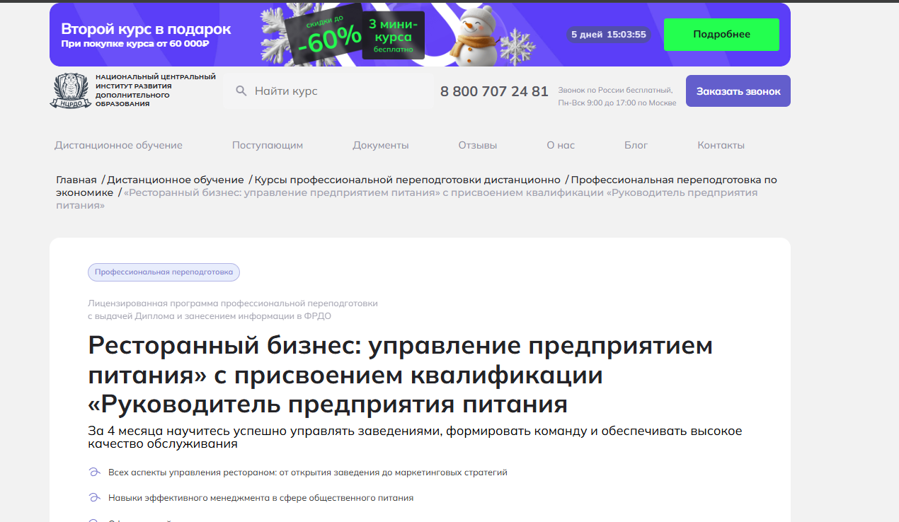 Руководитель предприятия питания от НЦРДО — курс профессиональной переподготовки для подготовки директоров ресторанов с изучением менеджмента, маркетинга и финансового планирования в общепите.