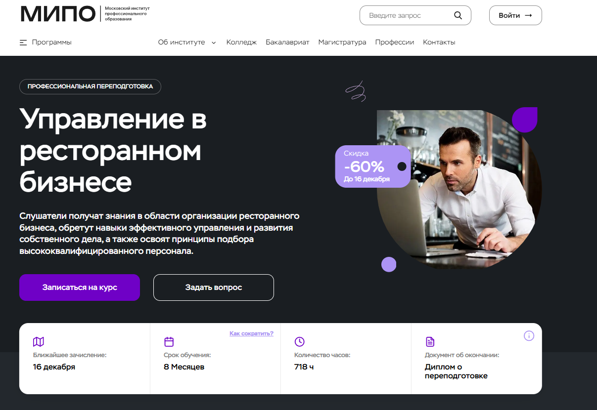 Управление в ресторанном бизнесе от Московского Института Профессионального Образования — профессиональная переподготовка для менеджеров с присвоением квалификации и изучением IT-технологий в общепите.