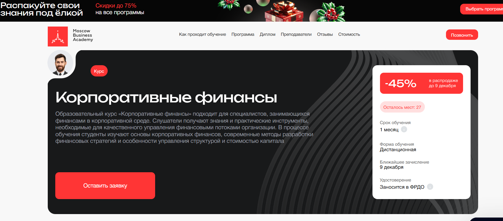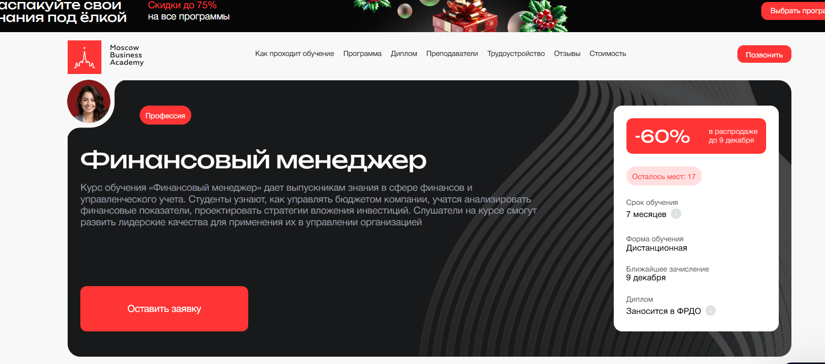 Финансовый менеджер от Moscow Business Academy — профессиональная переподготовка за 7 месяцев с поддержкой в трудоустройстве и официальным дипломом.