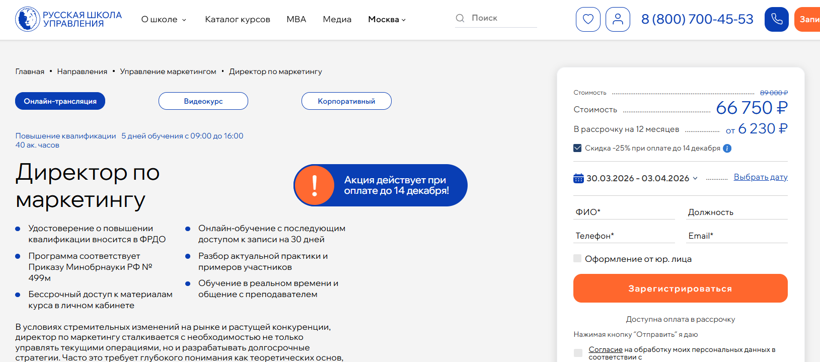 Директор по маркетингу онлайн от РШУ — онлайн-курс для топ-менеджеров с фокусом на стратегии маркетинга и управлении отделами.