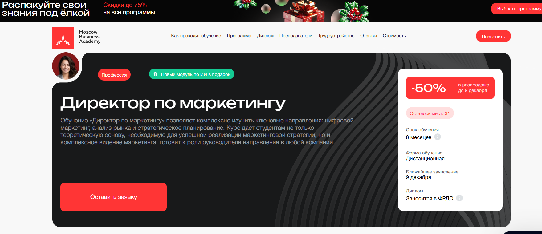 Директор по маркетингу от Московской Бизнес Академии — программа профессиональной переподготовки на 8 месяцев с дипломом и помощью в трудоустройстве.