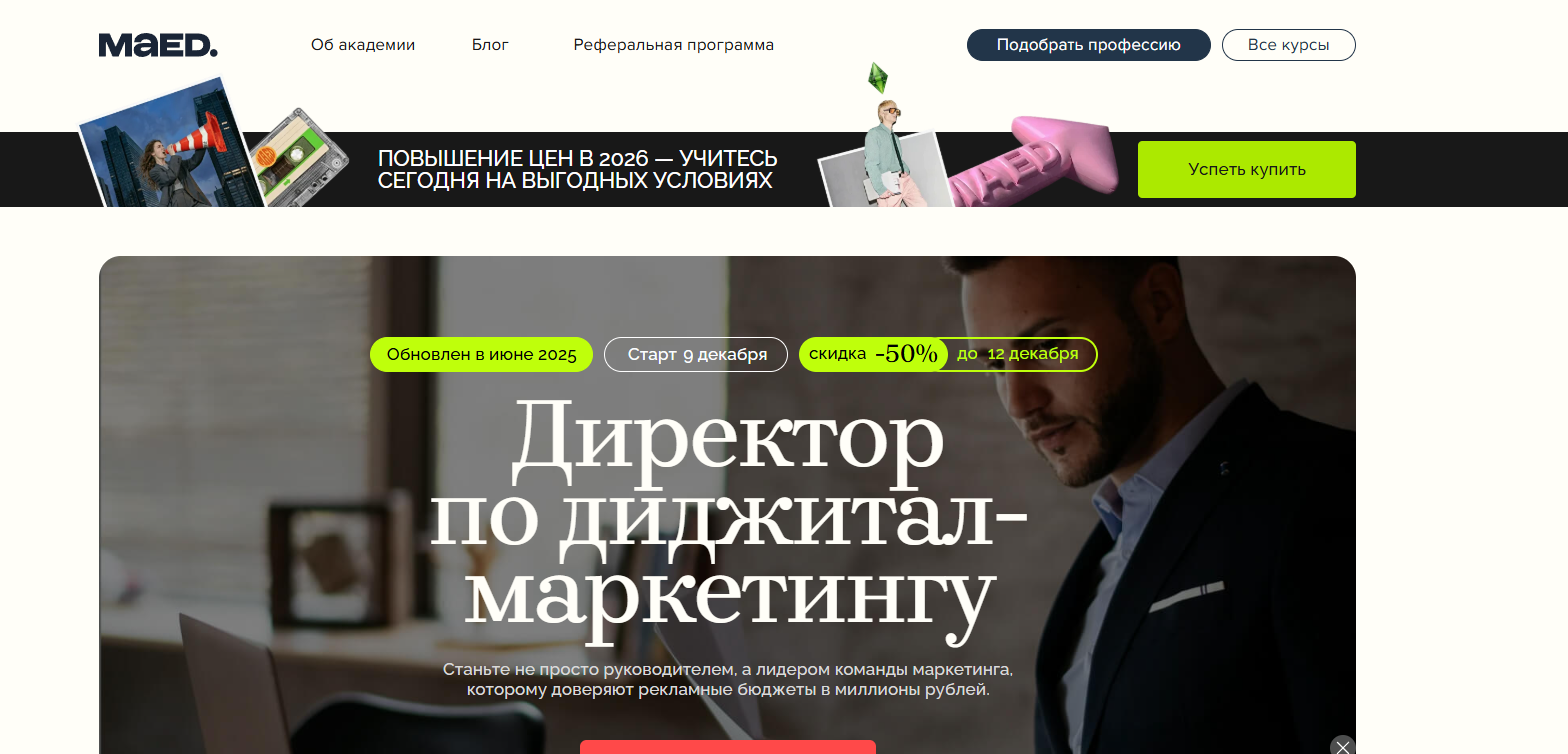 Директор по диджитал-маркетингу от MAED — 8-месячная программа с разработкой готовой стратегии и воркшопами от экспертов из Tinkoff и Яндекс.