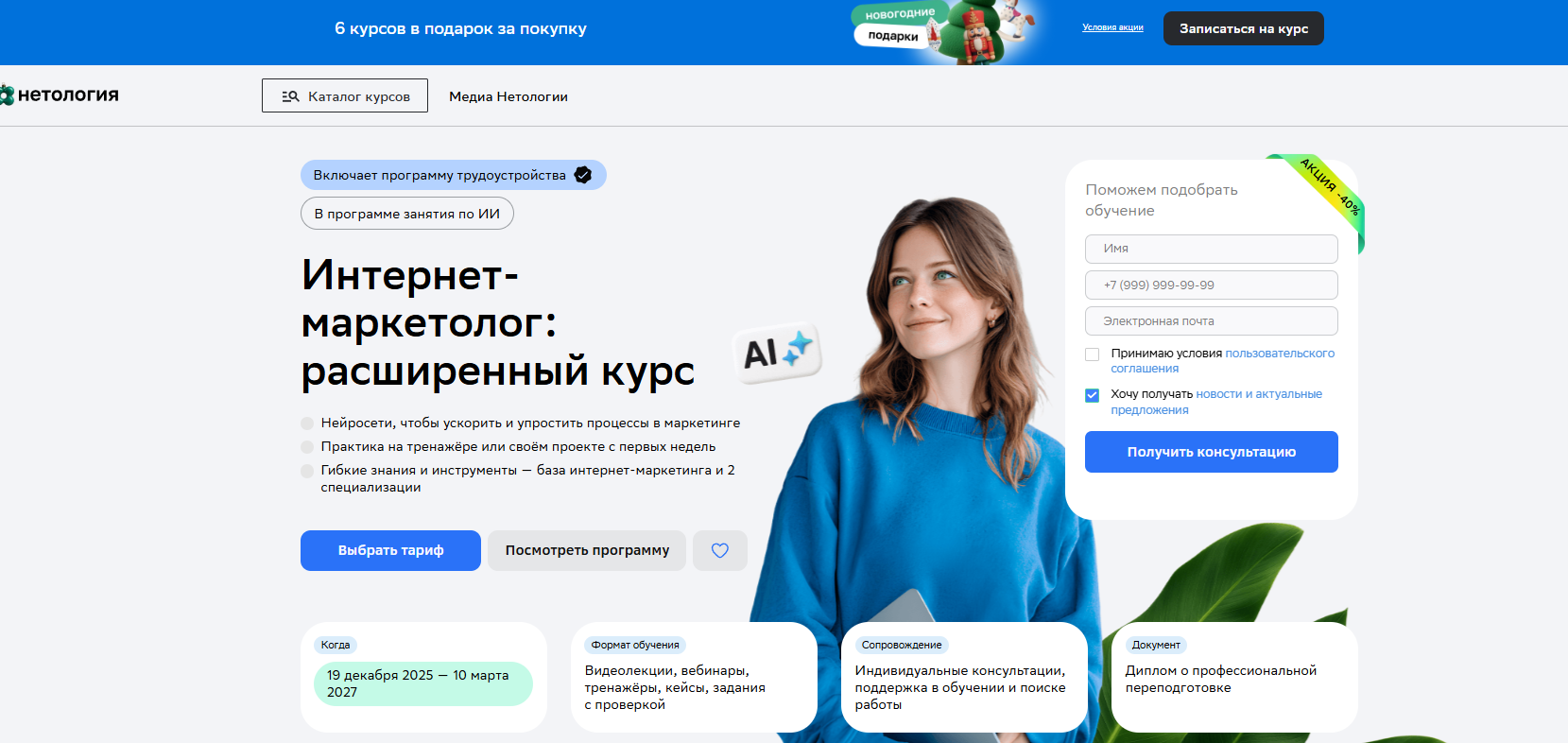 Профессия Интернет-маркетолог от Нетологии — расширенный курс с дипломом, индивидуальными консультациями и гарантией трудоустройства.