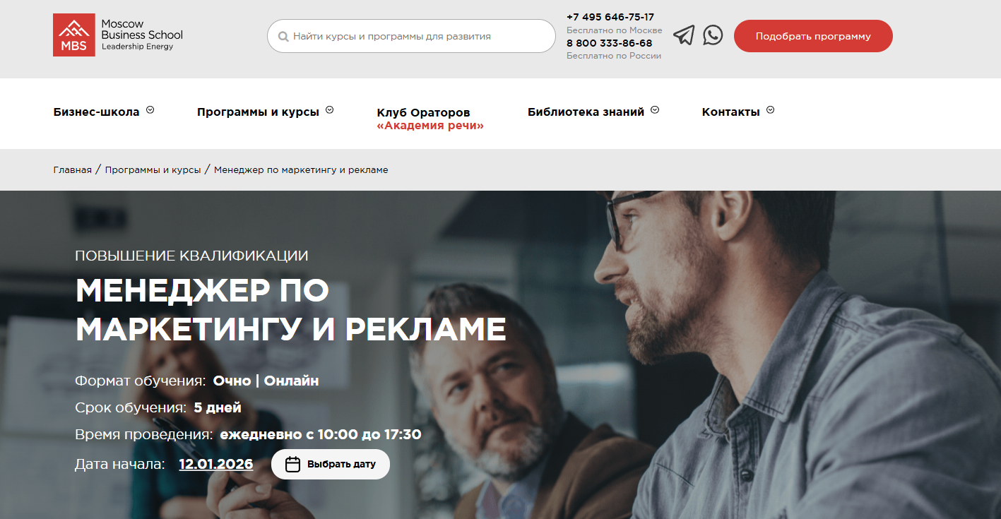 Менеджер по маркетингу и рекламе от Moscow Business School — практический курс с очным и онлайн-форматом, акцентом на настройке Яндекс.Директ и работе с маркетплейсами.