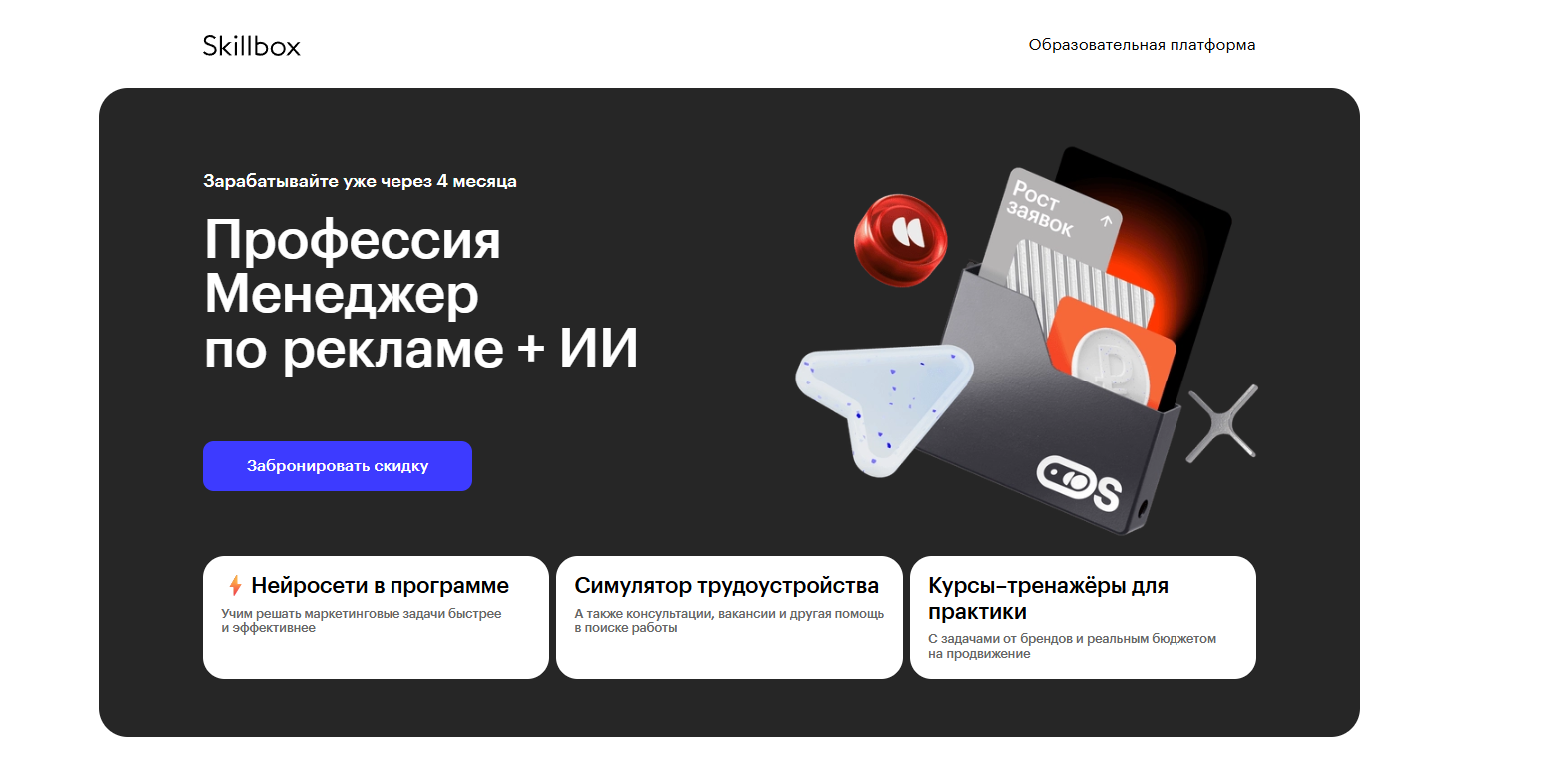 Профессия Менеджер по рекламе от Skillbox — курс с нуля до профессионала за 12-17 месяцев, включает специализацию на выбор и реальные проекты с бюджетом.