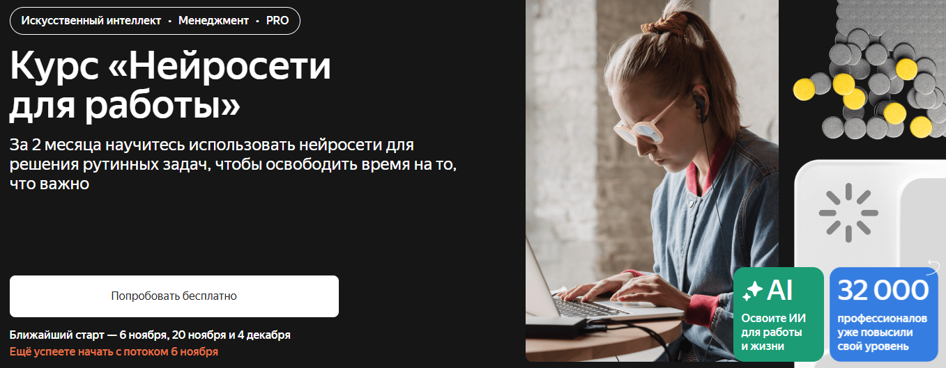 - Нейросети: практический курс — Skypro: Бесплатный доступ к ИИ-сервисам, фокус на применении в реальных задачах с первой недели.