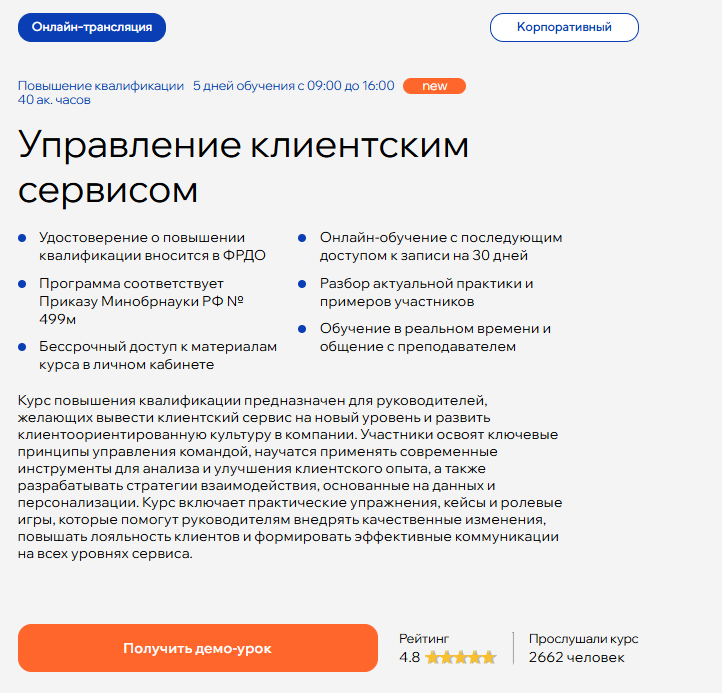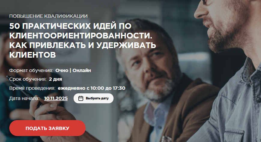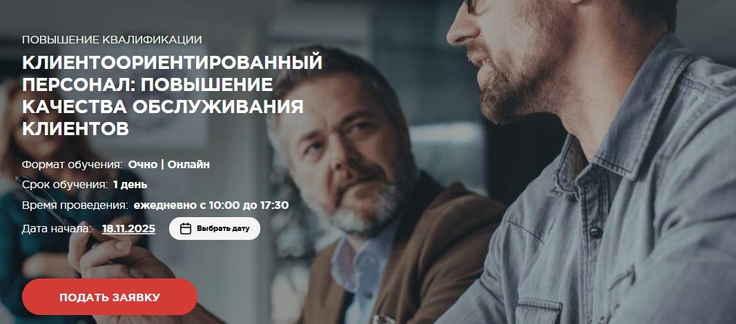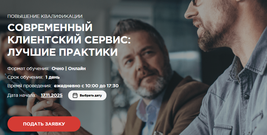 - Для кого подходит курс: руководителям и менеджерам сферы услуг, руководителям отделов клиентского сервиса и продаж, предпринимателям и специалистам, которым важно эффективное управление клиентским опытом и повышение лояльности клиентов