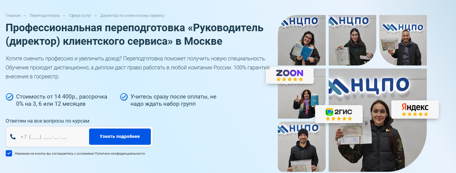 - Профессиональная переподготовка «Руководитель (директор) клиентского сервиса» в Москве — НЦПО