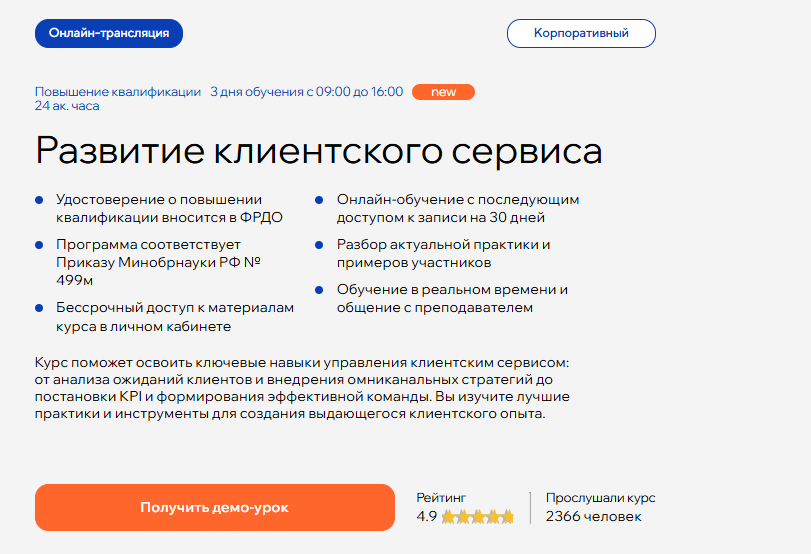Популярные форматы обучения: дистанционный формат, корпоративному обучению, онлайн-курсы, семинары, программы повышения квалификации, тренинги, бесплатные курсы, дистанционный курс. В процессе обучения слушатели освоят методы создания эффективных сервисных стратегий.