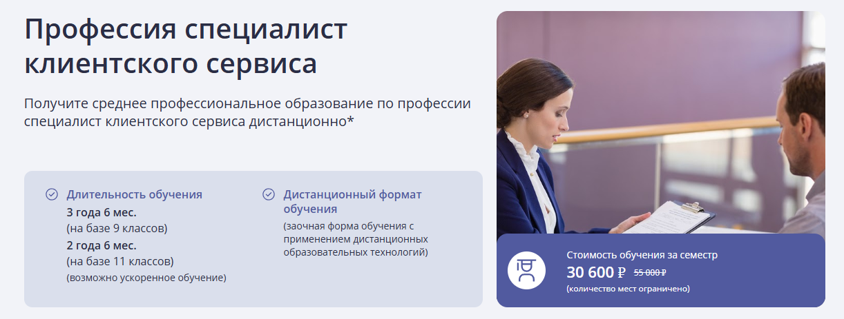 Получение среднего профобразования помогает развивать практических навыков работы с клиентами и понимать стандарты обслуживания. Студенты учатся грамотно реагировать на обращения, выстраивать эффективную коммуникацию и поддерживать клиентскую лояльность. Программа акцентирует внимание на сервисе, эффективности взаимодействия и умении анализировать обратную связь. Материалы адаптированы под современный рынок, поэтому важно научиться эффективно работать с запросами и выстраивать процессы обслуживания. Обучение включает задания, помогающие освоить навыков коммуникации и улучшить навыки решения вопросов клиентов. Слушатели изучают основы сервиса, учатся повышать лояльность и управлять сложными ситуациями. После окончания обучения выпускники готовы повышать клиентскую вовлеченность, контролировать стандарты сервиса, понимать метрики клиентского опыта и применять эффективных стратегий обслуживания. Большая часть занятий проходит онлайн, что позволяет совмещать учебу с работой и другими делами.