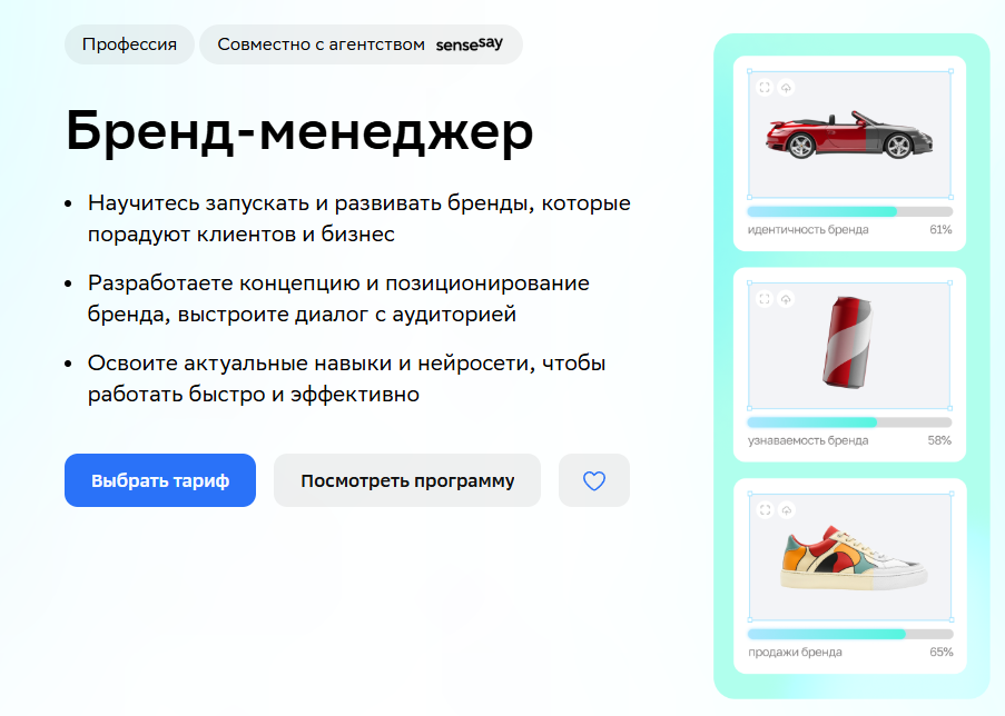 Программа направлена на освоение полного цикла бренд-менеджмента — от разработки платформы бренда до стратегий продвижения. Слушатели изучают маркетинговые коммуникации, инструменты анализа аудитории и современные подходы к позиционированию бренда. В процессе обучения студенты разрабатывают собственные стратегии продвижения и учатся управлять репутацией бренда. Особое внимание уделено интеграции нейросетей: участники осваивают более 10 ИИ-инструментов для ускорения задач. Обучение проходит в дистанционном формате с практическими кейсами, воркшопами и вебинарами. После окончания курсов выпускники получают диплом и поддержку карьерного центра, что помогает успешно начать карьеру бренд-менеджера.