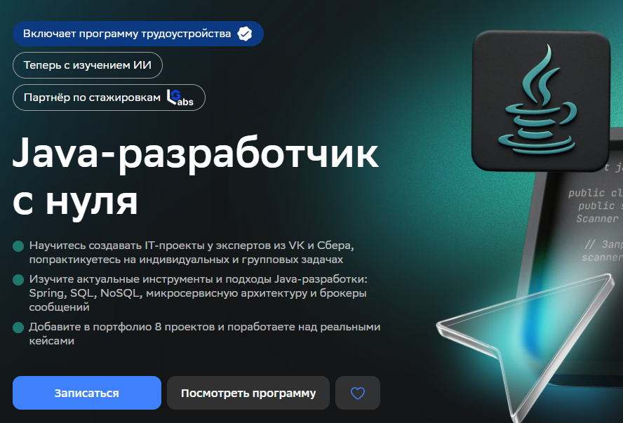 Skillbox — Java-разработчик + ИИ: связка Java и ИИ-инструментов, много командных проектов с ролью тимлида, акцент на реальных задачах от партнёров и стажировки для лучших студентов.