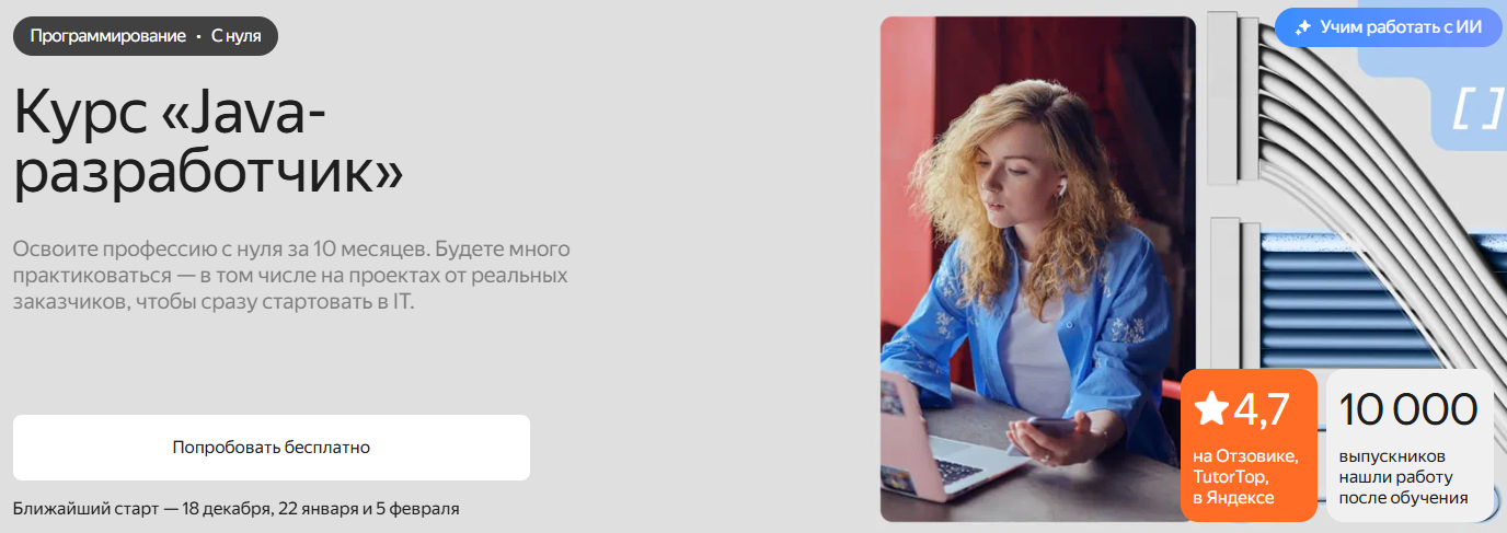 Яндекс Практикум — Мидл Java-разработчик: программа для действующих разработчиков с фокусом на Java 21, реактивный стек, микросервисы с Kafka и Kubernetes, обучение в формате спринтов с регулярными ревью.