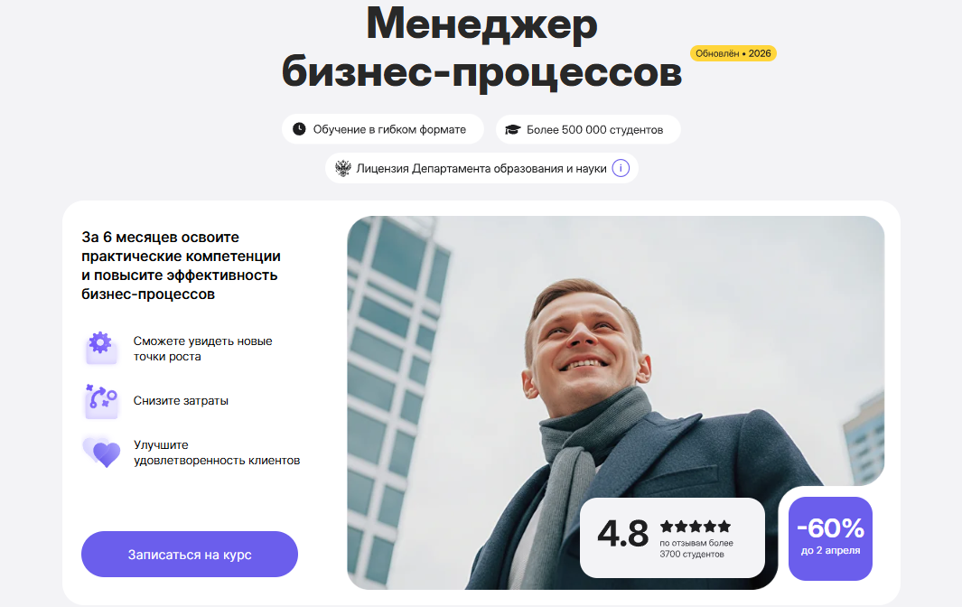 Программа построена для тех, кому важно связать управление командой с результатами компании и операционной эффективностью. Обучение проходит онлайн, поэтому его легко совмещать с работой и текущими задачами. Курс помогает освоить методы оптимизации, инструменты моделирования и подходы к описанию бизнес-процессов предприятия. В учебных материалах сделан акцент на практическое применение, анализ бизнес-процессов и повышение эффективности работы коллектива. Слушатель получает доступ к удобной платформе, где собраны видеоматериалы, задания и тесты для успешного прохождения обучения. Отдельное внимание уделено процессному подходу, управлению изменениями и внедрению новых решений в компании. Преподавателями выступают практикующие эксперты, поэтому обучение персонала и управление проектами рассматриваются на реальных задачах. После окончания обучения выпускники получают документы установленного образца, а сам курс подходит для повышения квалификации и развития управленческой подготовки. Материалы программы обновлены в 2026 году, что помогает изучать современные методы, цифровые технологии и инструменты оптимизации процессов без лишней теории.
