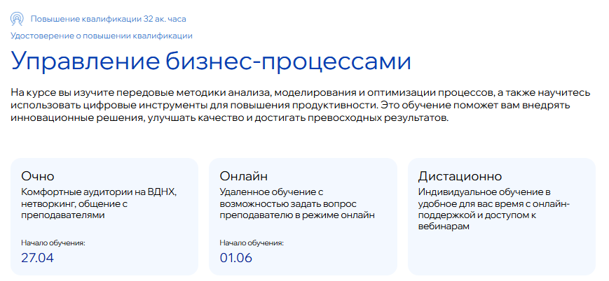 Программа повышения квалификации посвящена анализу бизнес-процессов, их описанию, регламентации и настройке под цели компании. Слушатели изучают инструменты моделирования и методы оптимизации, которые помогают работать над эффективностью бизнес-процессов и повышением операционной эффективности. Обучение проходит в трех форматах, поэтому можно выбрать подходящий вариант по графику, стоимости курса и способу изучения материалов. Очные занятия дают возможности для нетворкинга и живого диалога с экспертами, онлайн-формат подходит для тех, кому важна обратная связь в эфире, а для дистанционного обучения предусмотрена отдельная траектория с гибким стартом. В программе есть темы, посвященные внедрению процессного подхода, описанию бизнес-процессов предприятия, оценке эффективности и построению карты процессов. Участники научатся работать с моделью процессов верхнего уровня, выбирать процессы для первоочередной оптимизации и использовать практические инструменты для внедрения изменений. Отдельное внимание уделено KPI, процессному управлению, проектированию с ориентацией на потребителя и совершенствованию бизнес-процессов. После окончания обучения слушатель получает государственный документ, а доступ к материалам сохраняется в зависимости от выбранного формата. Курс ведут эксперты с практическим опытом в области качества, организационного развития, операционного менеджмента и управления бизнесом.