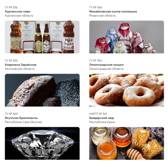 Это названия, указывающие на место происхождения товара: “Ленинградские пышки”, "Тульский пряник", "Вологодское масло", "Дымковская игрушка", “Якутские бриллианты”. Использовать их могут только производители из соответствующего региона.