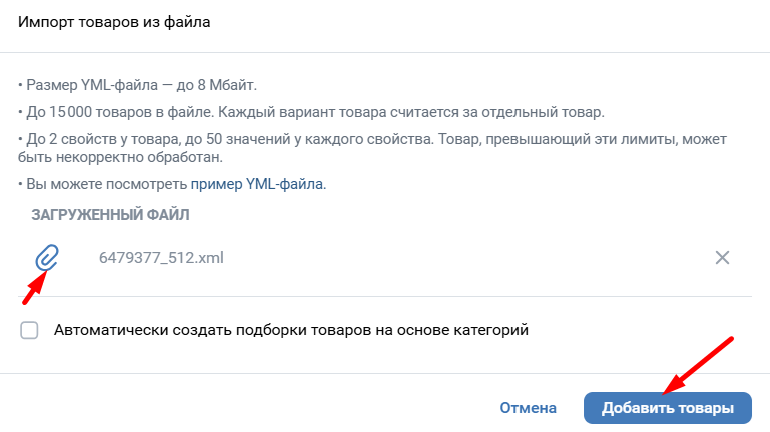 • объём YML-файла при выгрузке — до 8 МБ, не более 15 000 товаров;