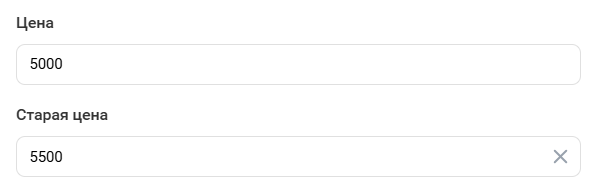 • Цена. Укажите актуальную стоимость и при необходимости старую цену для отображения скидки.