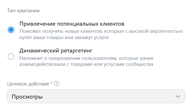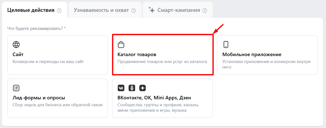 1. В разделе «Целевые действия» выберите цель «Каталог товаров».