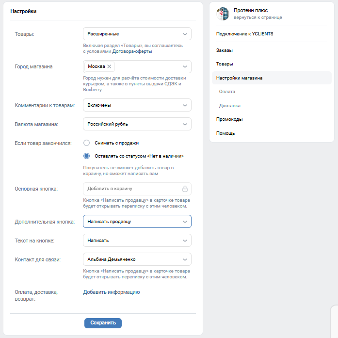 Затем переходят к настройке оплаты, доставки и возврата. В разделе «Магазин → Оплата» можно подключить приём платежей — банковские карты и VK Pay.