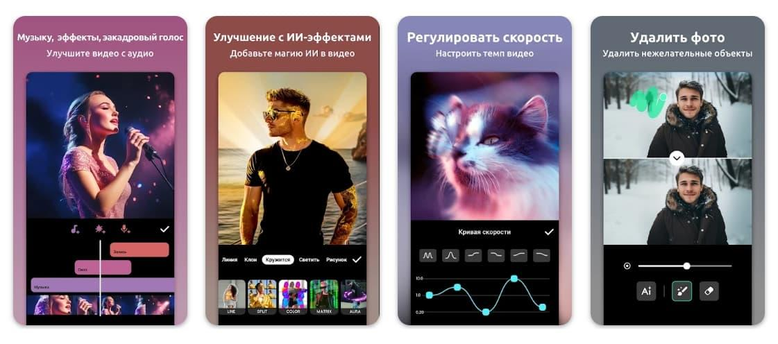 Отдельное внимание уделено звуку: пользователь может добавлять музыку, эффекты, голос за кадром или собственную озвучку. Готовый ролик экспортируется в 4K с возможностью сохранять черновики.