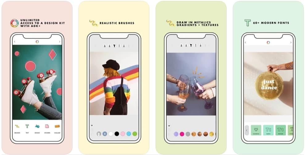 От других редакторов A Design Kit отличается акцентом на рисование. Здесь доступны десятки реалистичных кистей, с помощью которых можно рисовать однотонными цветами, градиентами или текстурами. После создания линии можно изменить её цвет, толщину и прозрачность. Кроме кистей, предусмотрены маркеры и карандаши, что делает приложение особенно удобным для тех, кто любит добавлять в сториз «живые» акценты.