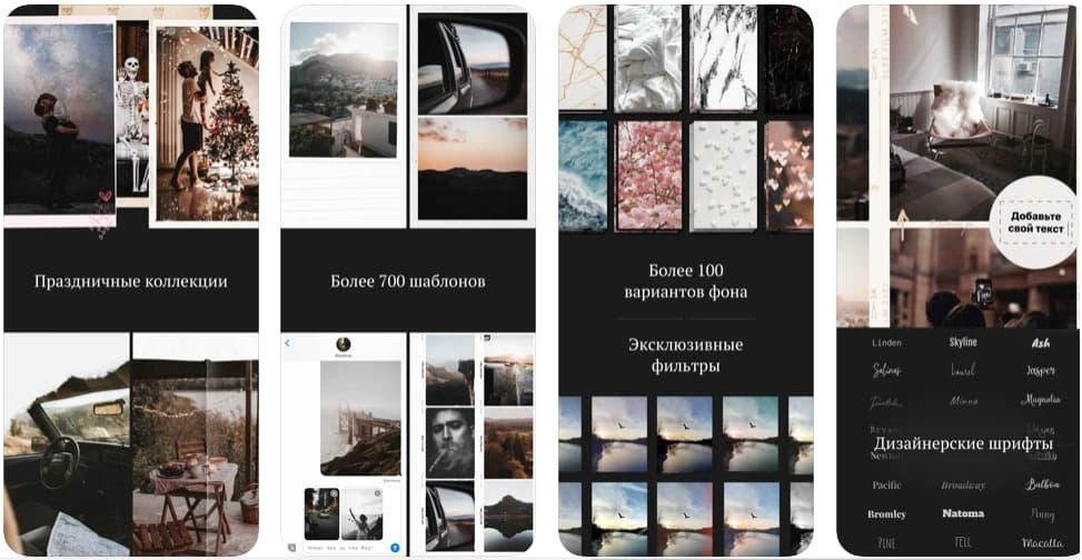 Контент можно добавлять из галереи телефона или искать фотографии прямо в приложении через библиотеку Unsplash. Макеты позволяют делать аккуратные коллажи, менять цвет фона (21 вариант), а также редактировать текст: