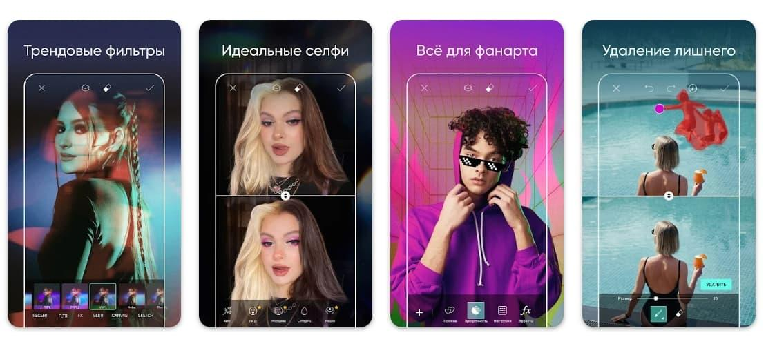 Picsart позволяет удалять фон одним касанием, вырезать объекты и кадрировать фото. Для работы с портретами есть функции ретуши селфи — изменение цвета волос, добавление макияжа, сглаживание кожи и другие эффекты.