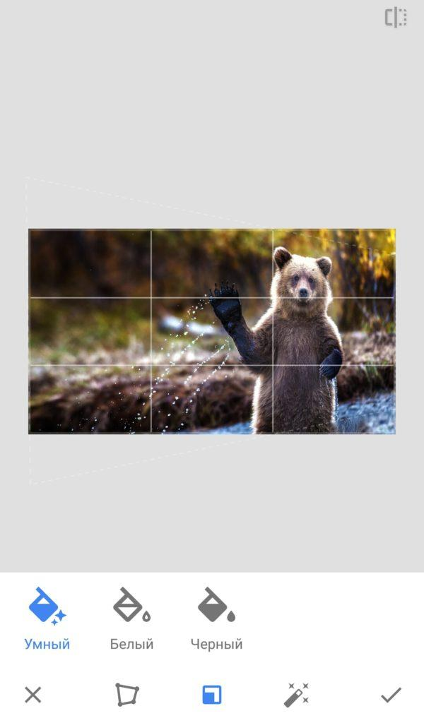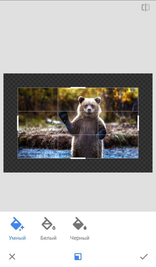 В этом разделе есть функция заполнения краев: пустые области можно залить белым, чёрным или доверить задачу «умному» заполнению.