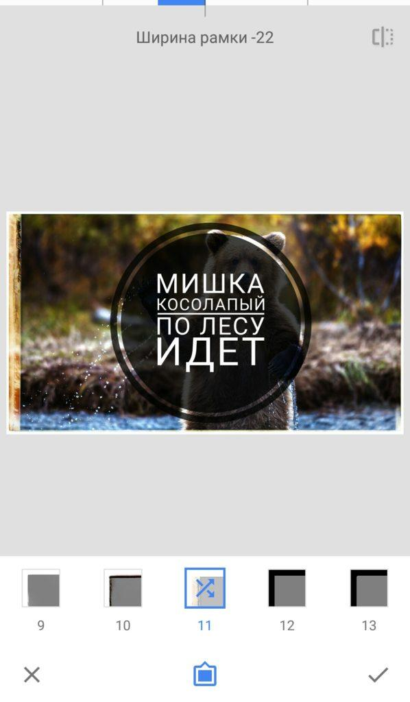 Завершая обработку, можно добавить рамку. В Snapseed доступно 23 варианта, причём некоторые из них имеют дополнительные стили. Чтобы открыть все возможные исполнения рамки, просто нажмите на её значок повторно — появятся дополнительные варианты с двухстрелочным индикатором.