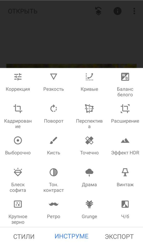 В Snapseed предусмотрено большое количество фильтров, и все они находятся в разделе «Инструменты». Здесь доступны такие эффекты, как: