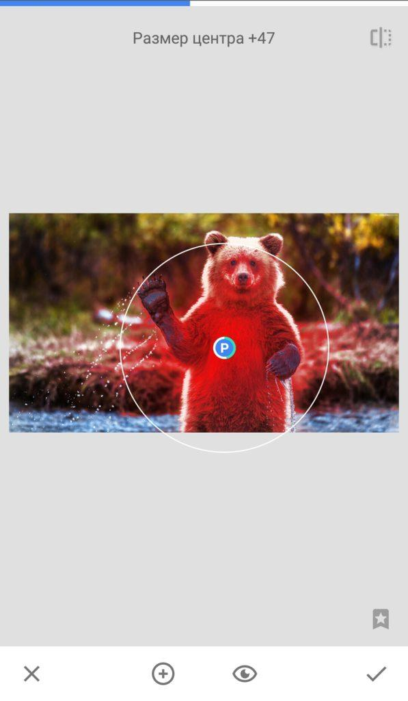 Внизу экрана появится значок с плюсом. Нажмите на него и коснитесь области снимка, которую хотите изменить — в этом месте появится контрольная точка. Разведите или сведите два пальца на экране: вокруг точки появится красный круг, обозначающий зону, на которую будет влиять настройка. Так можно увеличить или уменьшить область коррекции.