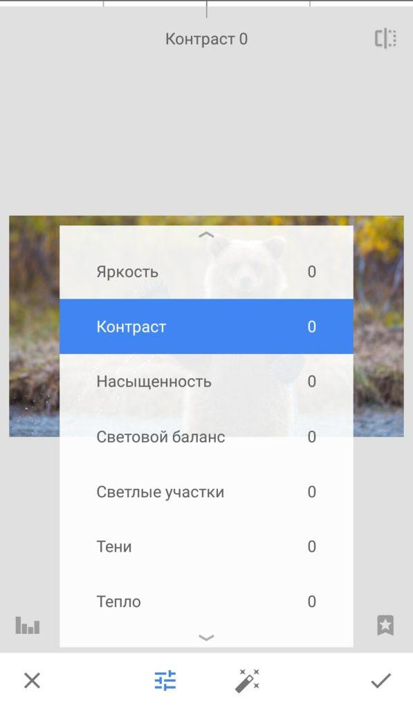 Например, чтобы изменить контраст, выберите этот параметр из списка. Все дальнейшие действия выполняются жестами: проведите пальцем вправо, чтобы усилить эффект, или влево — чтобы уменьшить. Текущее значение отображается в верхней части экрана, поэтому контролировать изменения легко.