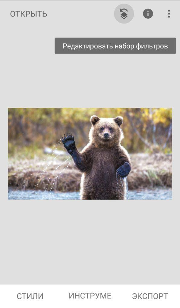 После того как фото появится на экране, в нижней части интерфейса откроются три раздела: «Стили», «Инструменты» и «Экспорт».