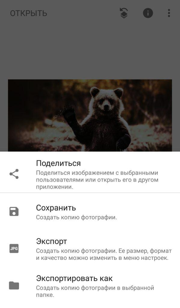 «Экспорт». Сохраняет изображение с учётом всех фильтров и правок. Размер файла может увеличиться, особенно если в настройках указано максимальное качество. Фото сохраняется в папку Snapseed.