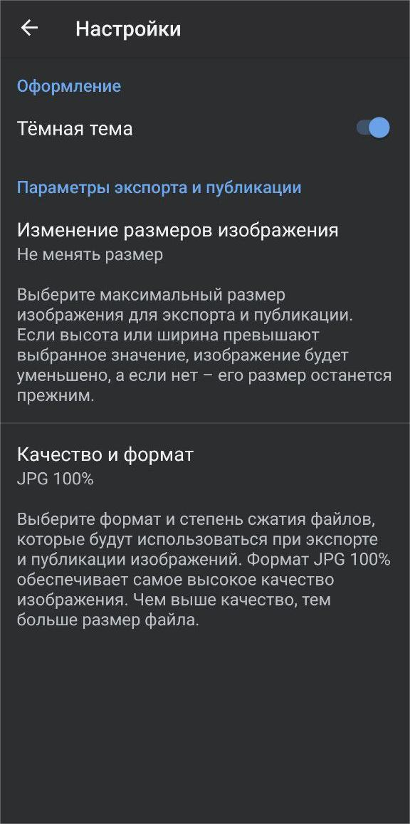 Прежде чем переходить к обработке кадра, стоит уделить пару минут настройкам приложения. Откройте меню, нажав на значок с тремя точками в правом верхнем углу — внутри находится раздел со всеми параметрами, которые повлияют на итоговое качество изображений.