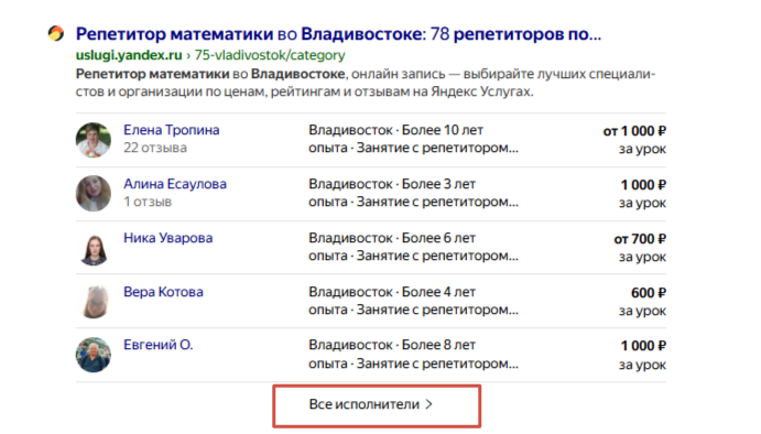 Например, по образовательным запросам может появляться расширенный сниппет онлайн-школы, а по запросам, связанным с поиском работы, — колдунщик hh.ru.