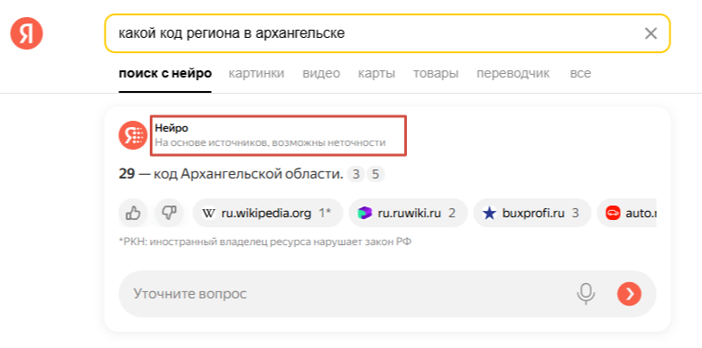 Точного алгоритма попадания в этот колдунщик нет: система автоматически отбирает документы, которые уже попали в индекс. Это означает, что сайт должен быть полностью доступен роботам и корректно проиндексирован — иначе ни Нейро, ни быстрые ответы просто не смогут использовать его содержание.