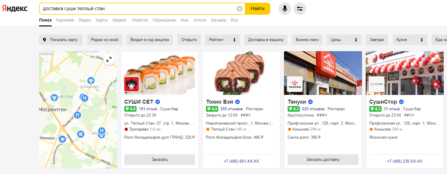 До 2020 года запросы по доставке еды почти всегда сопровождались ярким колдунщиком Яндекс Еды с каруселью заведений.