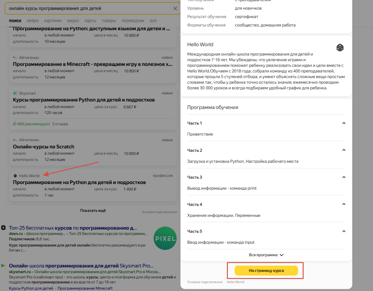 По запросам, связанным с обучением, Яндекс показывает расширенный сниппет с подборкой онлайн-курсов. В карточках указаны цена, продолжительность, дата старта, количество часов. По клику открывается краткое описание курса и кнопка перехода на сайт платформы.