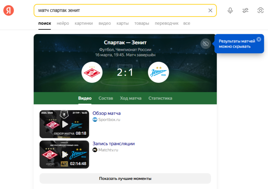 результаты спортивных матчей (плюс обзор, статистика, состав команд, возможность скрыть счёт);