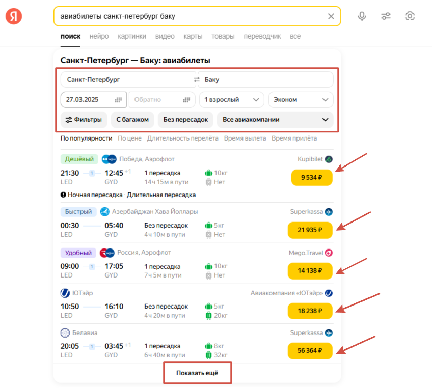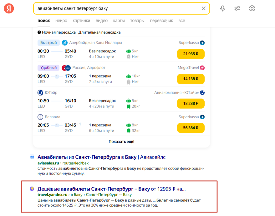 Внутри сниппета — фильтры по датам и стоимости, выбор вида транспорта, варианты перелетов, поездок на автобусах и поездах. Пользователь может забронировать билет прямо в Яндексе или перейти к партнёру.