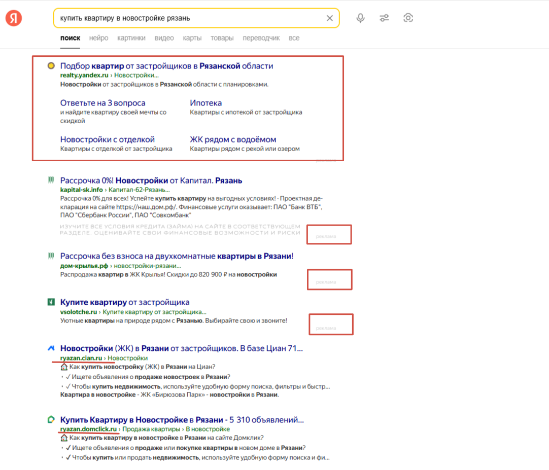 По запросам о покупке или аренде жилья Яндекс сначала показывает объявления своего агрегатора. Формат выглядит так: