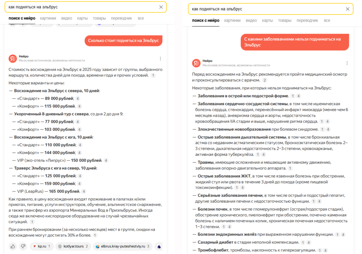 В информационных запросах первое, что видит пользователь, — это блоки Нейро. Они занимают так называемую «нулевую позицию» или фиксируются в правой колонке SERP, полностью перетягивая внимание на себя.