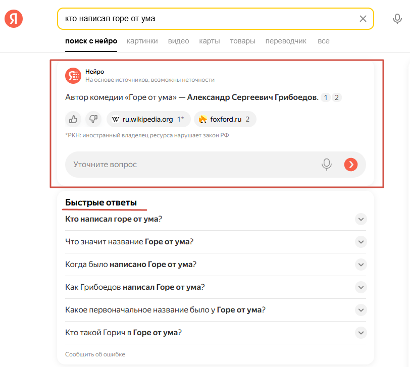 Рядом с Нейро нередко появляется второй элемент — «быстрые ответы». Это небольшой сниппет, где поисковик собирает связанные подзапросы и коротко отвечает на них, указывая источник.