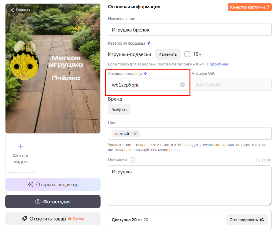 Если продавец оставляет поле пустым, система автоматически назначает артикул.