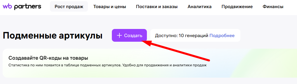 Если на площадке действует акция, рядом отображается количество доступных бесплатных кодов. После создания подменного артикула появятся дополнительные ссылки — именно их используют для рекламных размещений, чтобы понимать, какие каналы приносят лучший результат.